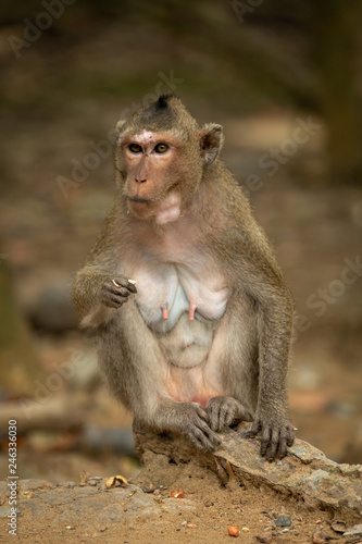 © Nick Dale, Fototapeta premium Long-tailed macaque sits eating on sandy rock