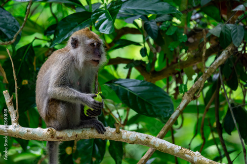 Obraz premium Long tailed macaque while eating fruits and sitting on a tree branch