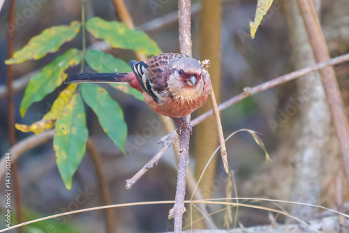 Fototapeta premium 食事中の可愛いベニマシコ(アトリ科) 英名学名:Long-tailed Rosefinch (Uragus sibiricus) 神奈川県清川村、早戸川林道-2025年