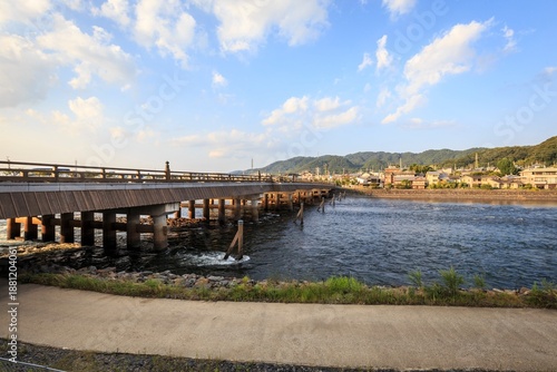 © Bossa Art, Fototapeta premium Long Traditional Wooden Uji Bridge Spanning the River at Golden Hour