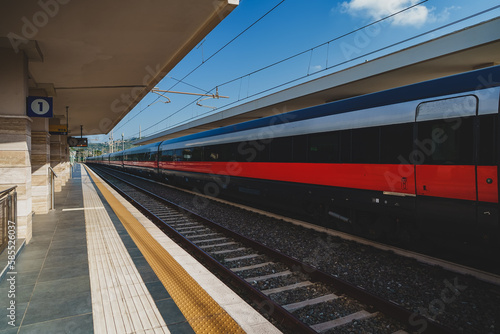 © M-Production, Naklejka premium Long train arrives at rural train station in Italy.