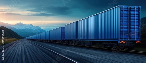 © khonkangrua, Fototapeta premium Long Train of Blue Freight Containers Traveling Through Scenic Mountain Landscape at Dusk