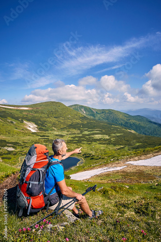 © Bondariev Volodymyr., Naklejka premium Long trip to the top of the mountain in the summer.