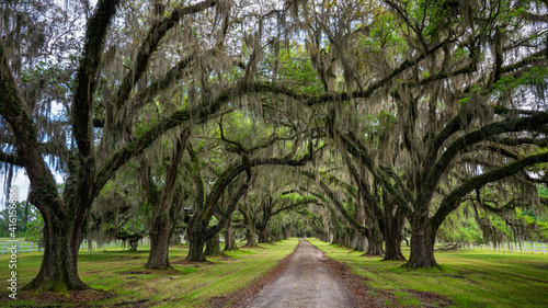 Obraz premium Long tunnel canopy of Live Oak Trees - Tomotley Plantation entrance -...