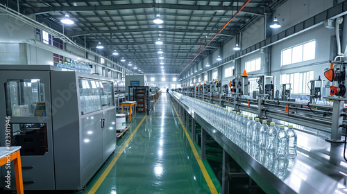 Naklejka premium Long View of a Modern Bottling Factory with Various Machinery and Water Bottles on Conveyor Belts, Emphasizing Scale and Automation