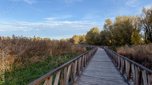 © Igor, Obraz premium Long wooden boardwalk surrounded by tall reeds and autumn trees