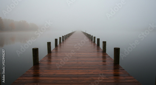 © Graphic Web, Fototapeta premium Long Wooden Pier Disappearing into Fog - Serene Lake Landscape Misty Lake Dock at Dawn - Tranquil and Atmospheric Scene