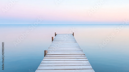 © The Origin 33, Obraz premium long wooden pier extending into calm ocean at sunset