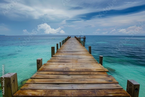 © nsit0108, Obraz premium Long wooden pier extending into crystal clear turquoise water with a beautiful cloudy sky in the background