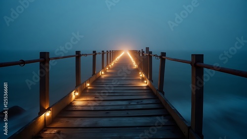 © DavoeAnimation, Naklejka premium Long wooden pier extending into foggy sea with glowing lights at dusk