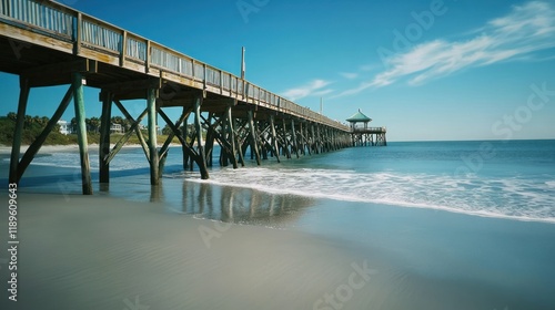 Obraz premium Long wooden pier extending over calm ocean, reflecting on sandy beach under...