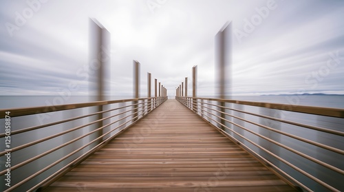 © Akun, Obraz premium Long wooden pier extending to calm sea under cloudy sky.