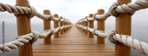 © pvl0707, Fototapeta premium Long wooden pier extends over calm water, inviting peaceful reflection and connection with nature while under a serene, cloudy sky