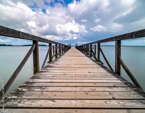 © kiting, Obraz premium Long wooden pier extends over calm water under a cloudy sky