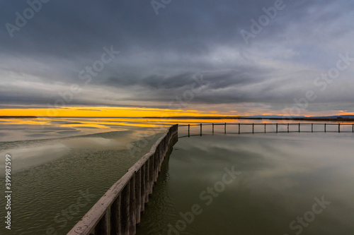 Fototapeta premium long wooden railing in a frozen lake with sun and rain clouds