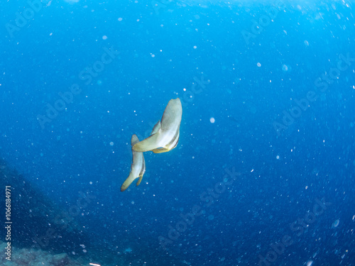 Fototapeta premium 美しく不思議なツバメウオ(ツバメウオ属)のペア他。 英名学名:Longfin Batfish, Platax teira 静岡県伊豆半島賀茂郡南伊豆町中木ヒリゾ浜2024年