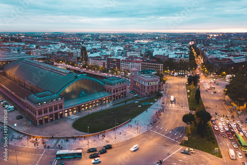 © Nauris, Fototapeta premium look from above view aerial drone shot Spain Madrid capital cloudy evening buildings lamps traffic Estación del Arte