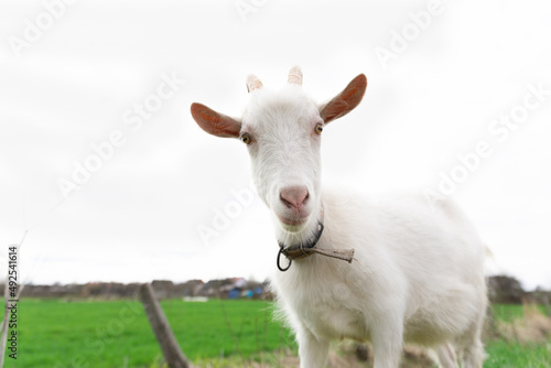 Fototapeta premium Look of a white goat in a meadow in spring
