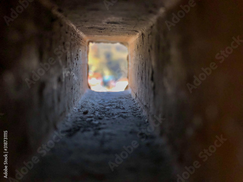 Obraz premium Look through the inside of rectangle brick hole in different perspective and affinities , sunlight is seeping in