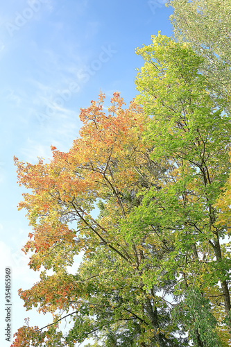 Naklejka premium look up branches of autumn trees / abstract background, autumn landscape, yellow leaves on trees in the sky