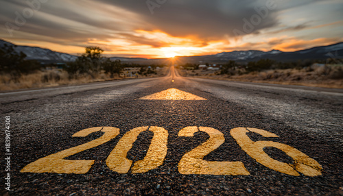 © Daniel, Naklejka premium Looking ahead to 2026: A road to future vision. The image features an arrow pointing the road towards 2026 with a beautiful sky and mountains in background.