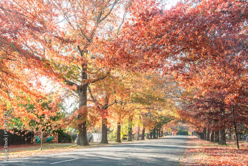 © jodie777, Naklejka premium Looking along a canopy of autumn trees in the early morning sun.