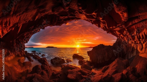 © graphicstormdesigns, Fototapeta premium Looking at the ocean from inside a cave at sunset