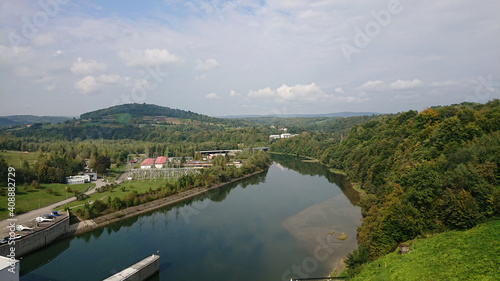 © CuteIdeas, Fototapeta premium Looking at the wide river flowing between the hills