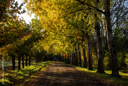 Naklejka premium Looking down a country lane framed by trees going gold in the fall, late afternoon sun casting long shadows across the gravel.