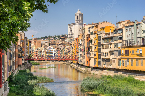 Fototapeta premium Looking down the Onyar River to the Eiffel bridge in Girona