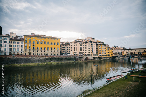 Naklejka premium Looking out at the Arno River and Ponte Vecchio in Florence, Italy at Sunset