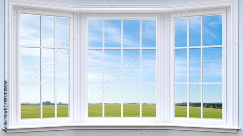Naklejka premium Looking out from a charming bay window, the bright summer day showcases a vivid blue sky and a green lawn, creating a serene and inviting atmosphere