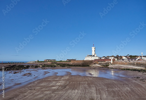 © Julian, Fototapeta premium Looking over the small Beach adjacent to Arbroath Harbour south to the Signal Tower Museum one early Summers morning in May. Arbroath, Angus, Scotland.