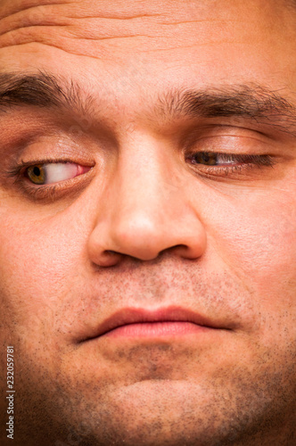 © YKD, Obraz premium Looking right, pry man. Facial expression, emoji face, emotion close-up.