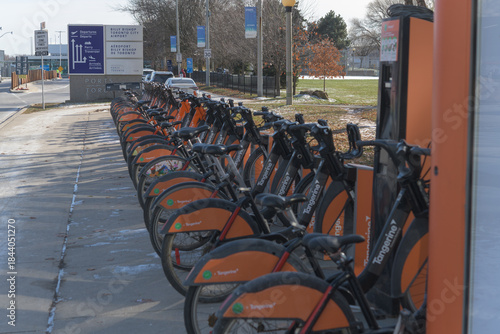 © eugen, Fototapeta premium looking south on Eireann Quay incl sign at Billy Bishop Toronto City Airport and Bike Share docking station