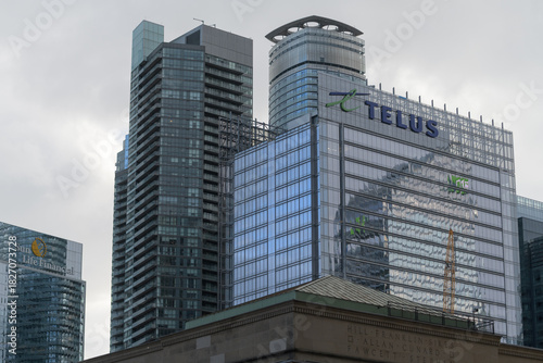 Fototapeta premium looking south to a cluster of buildings incl TELUS Harbour, a corporate office, located at 25 York St, seen here from Front St W and Bay, Toronto