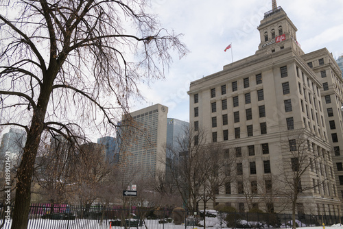Fototapeta premium looking southeast across a green space north of Canada Life Building (1931) with tree from Simcoe St, Toronto