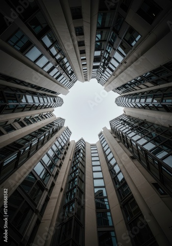 © photohappy, Fototapeta premium Looking straight up at a dizzying array of modern, smooth architectural facades and vertical lines, creating a sense of massive scale and height ,pattern ,lines ,imposing
