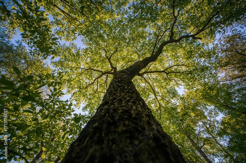 © Emin, Naklejka premium Looking Up at a Leafy Branch of a Green Tree, Symbolizing a Healthy Planet and Nature