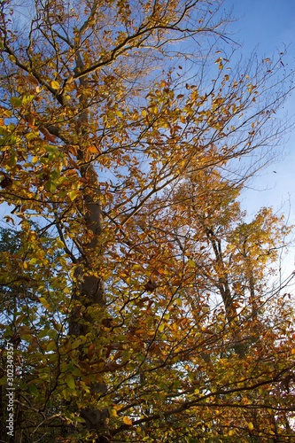 Fototapeta premium Looking up at autumn foliage, trees during sunset in Fall