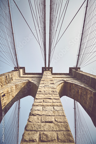 Obraz premium Looking up at Brooklyn Bridge, color toned picture, NYC.