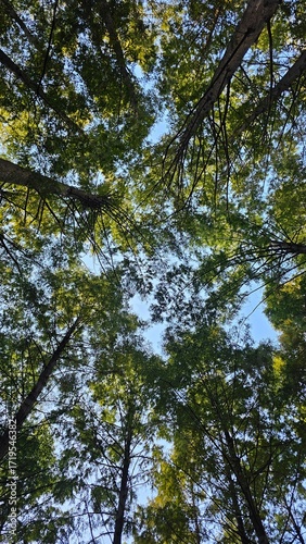 Obraz premium Looking up at forest canopy 숲의 나무 그늘을 올려다본 풍경