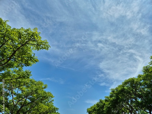 © Hendra Susanto0311, Obraz premium Looking up at green tree leaves framing a bright blue sky on a clear day. Copy space background