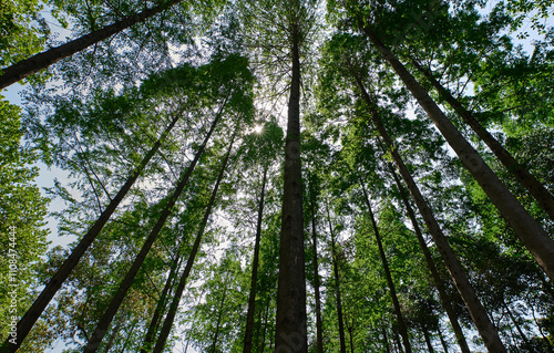 Obraz premium Looking up at the dense forest from a low angle, the sun shines through the leaves