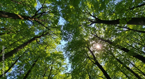 Obraz premium Looking up at the green tops of trees.