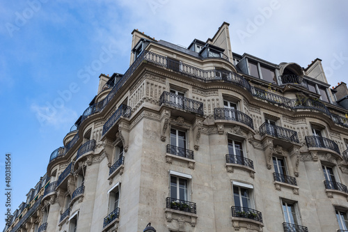 © Richard, Fototapeta premium Looking up at vintage Parisian apartment building with iron balconies