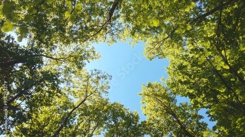 © Achmad Khoeron, Obraz premium Looking up Green forest. Trees with green Leaves, blue sky and sun light. Bottom view background