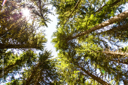 Obraz premium Looking up green trees forest background and sun between trunks