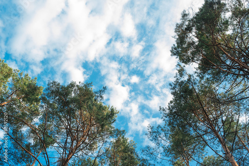 Obraz premium Looking up in pine forest tree to canopy