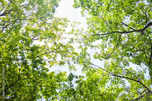 © meteo021, Fototapeta premium Looking up in the spring forest, through green leaves